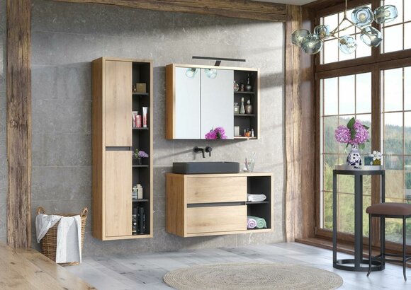 Entdecken Sie das Design Badezimmer Möbel Bad 3 tlg. Set von XL Moebel! Dieses stilvolle Set besteht aus einem Waschtisch, einem Schrank und einem Spiegelschrank, die perfekt zusammenpassen. Hergestellt aus hochwertigem Holz in der Farbe wie abgebildet, verleiht dieses Set Ihrem Badezimmer Eleganz und Funktionalität. Mit Maßen, die perfekt in Ihr Badezimmer passen, ist dieses Set eine großartige Ergänzung für Ihr Zuhause. Optional sind eine freistehende Armatur, passender Siphon und Kopfstützen erhältlich, um das Set zu vervollständigen. Holen Sie sich jetzt Ihr neues Badezimmermöbel Set und bringen Sie Stil in Ihr Zuhause!