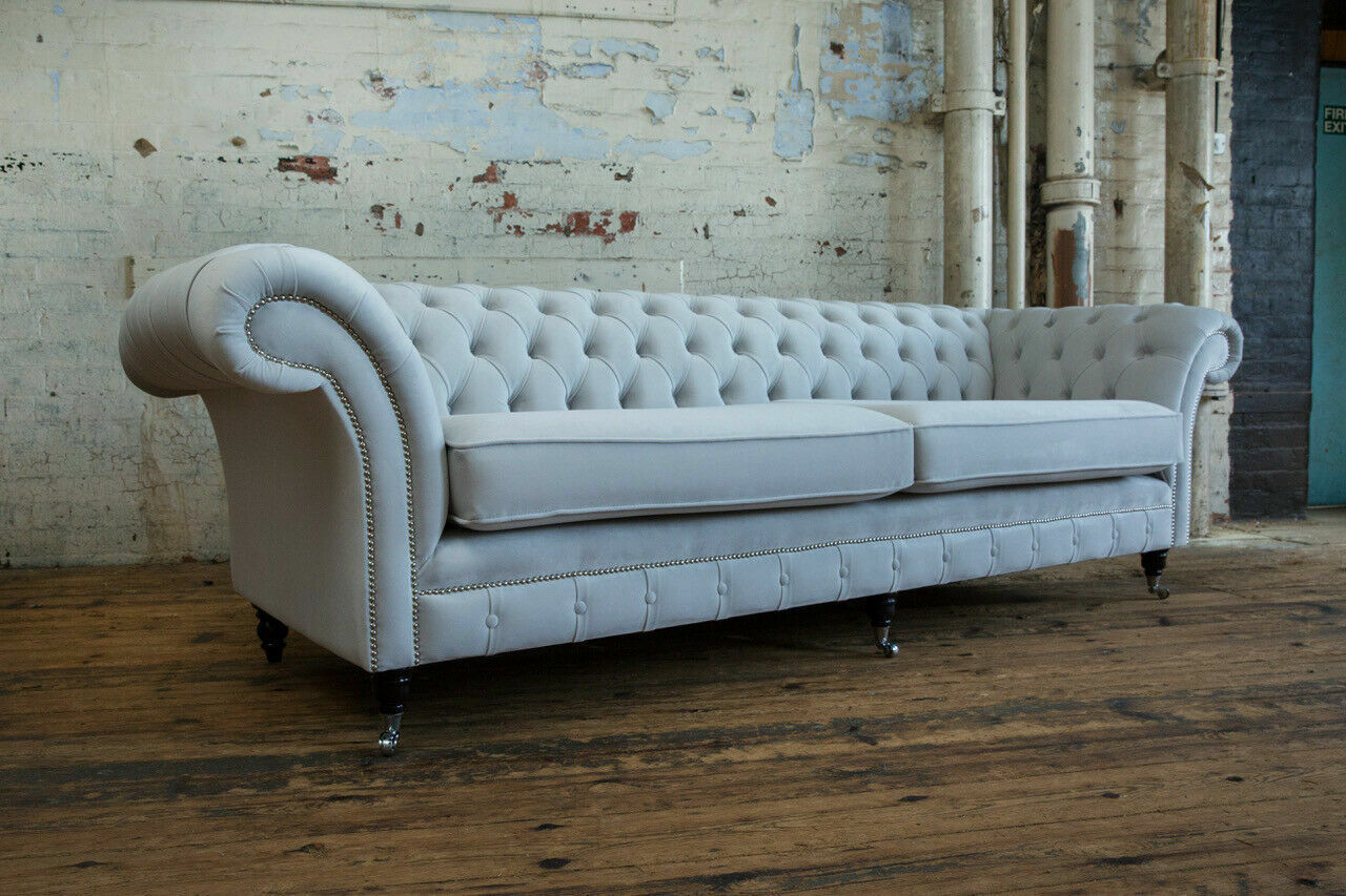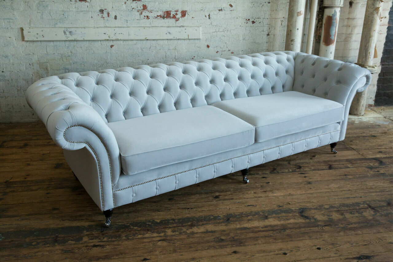 Grauer Chesterfield 4 Sitzer Polster Couch Modern Stil Samt Textil Stoff Sofa