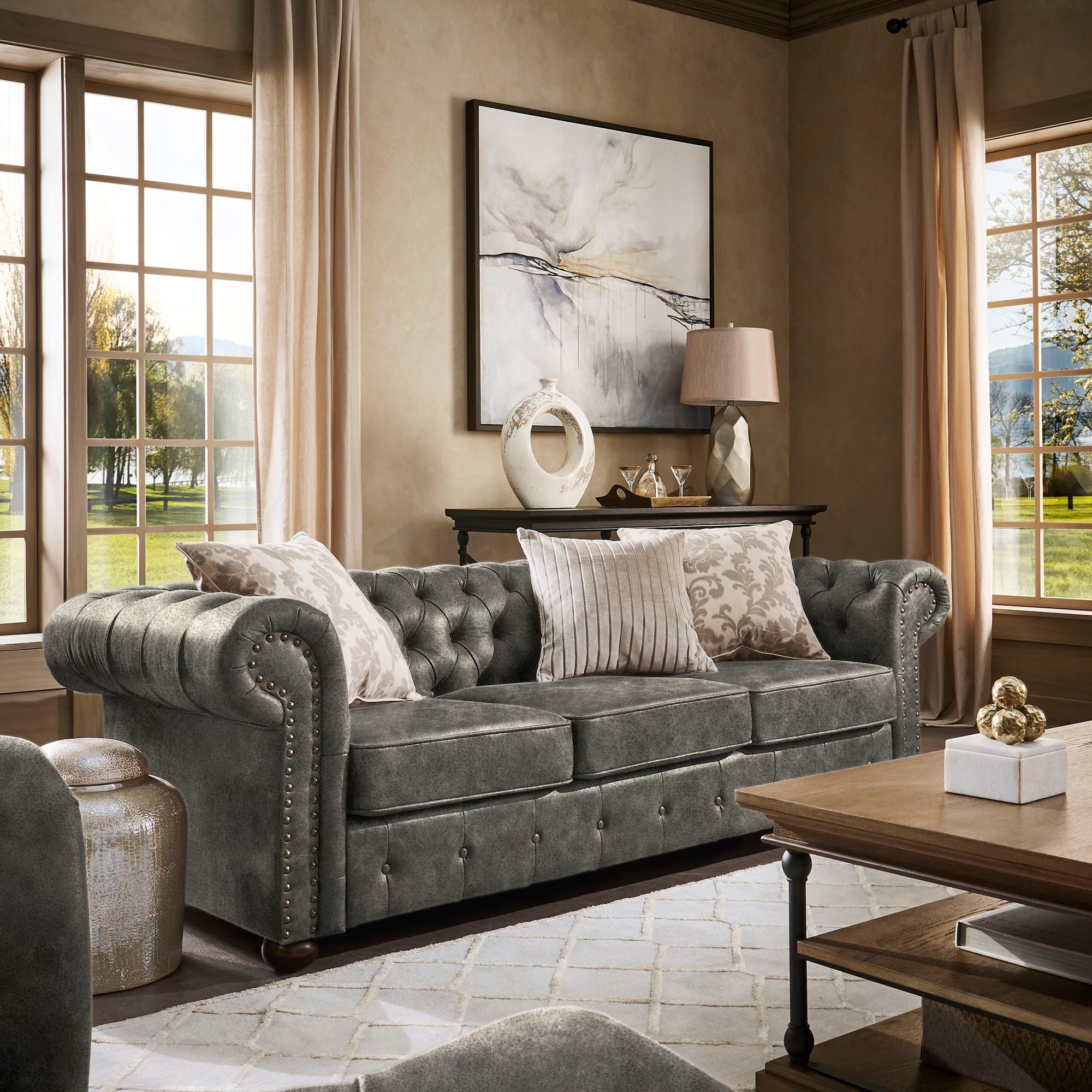 Dank seiner klassischen Ausstrahlung eignet sich das Chesterfield 3-Sitzer Sofa ideal für stilvolle Wohnräume, Empfangsbereiche oder Lounges. Die Möglichkeit einer Bettfunktion mit Matratze bietet zusätzlichen Nutzen für Gästeübernachtungen. Mit weiteren Größen wie dem 5-Sitzer oder 4-Sitzer aus derselben Serie können Sie Ihre Einrichtung harmonisch ergänzen. Auf Anfrage sind auch Sondergrößen oder Maßanfertigungen möglich, um Ihre individuellen Anforderungen zu erfüllen. Erleben Sie Luxus und Komfort mit dem Chesterfield 3-Sitzer Sofa. EAN: 4062292300998