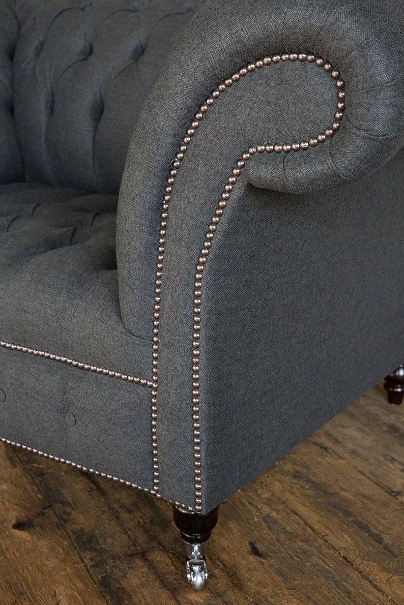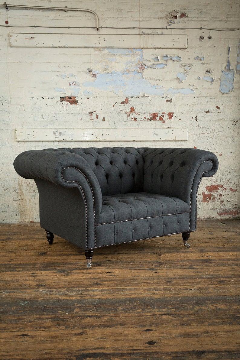 Das Chesterfield Design Sofa Sessel Couch Polster Luxus Textil Couchen 1 Sitzer #111 ist ein exquisites Möbelstück, das Eleganz und Komfort vereint. Mit Maßen von ca. 110cm x 90cm x 80cm bietet dieser 1-Sitzer eine großzügige Sitzfläche mit einer Sitzhöhe von ca. 44cm und einer Sitztiefe von ca. 60cm. Optional sind auch 2-Sitzer und 3-Sitzer Varianten erhältlich, um den Raum nach individuellen Bedürfnissen zu gestalten. Das hochwertige Textilmaterial ist in verschiedenen Farben erhältlich und bietet eine Auswahl an Premium Kunstleder, Echtleder, Samt Stoff oder Fleckenabweisendem Stoff. Das Innengestell aus echtem Holz und der Federkern sorgen für Stabilität und Bequemlichkeit.