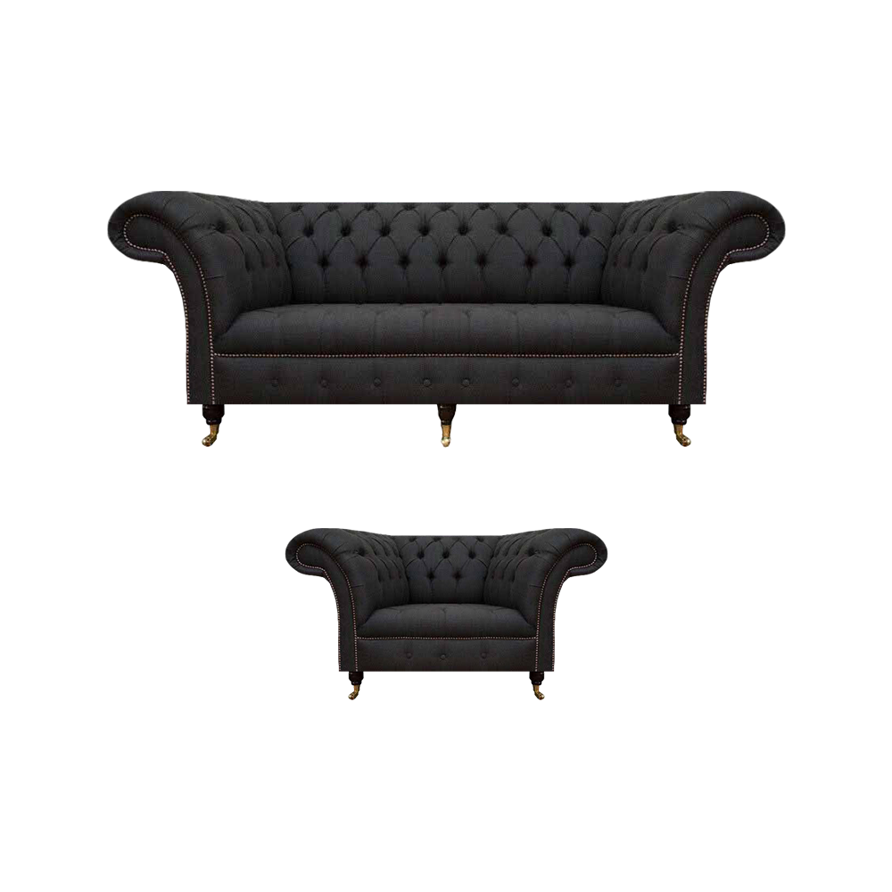 Chesterfield Schwarze Stoffgarnitur Designer 3-Sitzer Polstersessel 2tlg