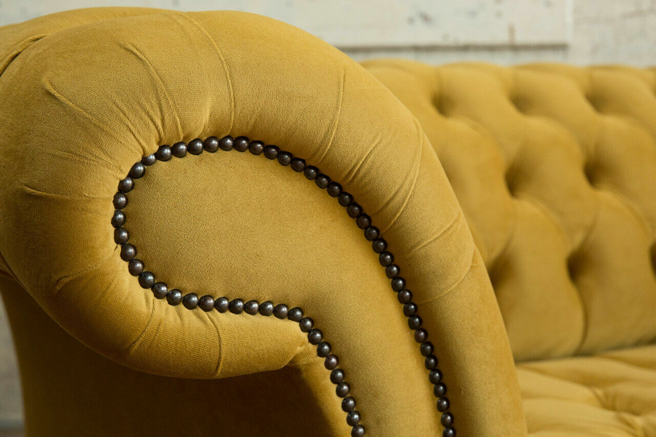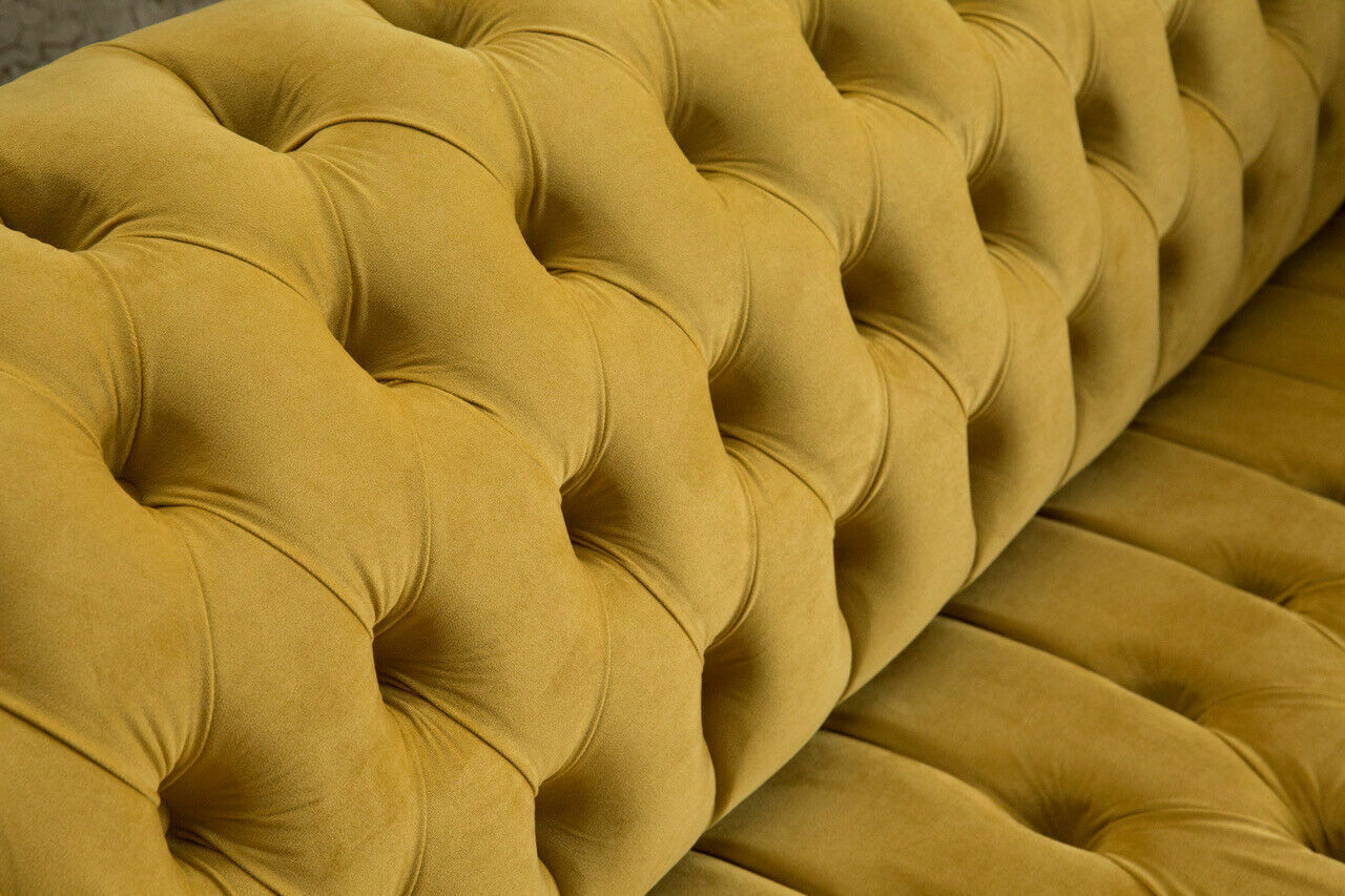Erhalten Sie noch heute unser exklusives Gelbes Designer Chesterfield Dreisitzer Luxus 3-er Couch Wohnzimmer Sofa! Dieser weiche Dreisitzer ist ein wahres Schmuckstück und wird in verschiedenen Größen und einer Vielzahl von Farben angeboten. Wählen Sie aus einer breiten Palette von Farben wie Taubengrau, Sonnengelb, Lavendelgrau, Currygelb und vielen mehr. Hergestellt aus hochwertigem Textilmaterial und optional auch in Premium Kunstleder, Echtleder oder Samt Stoff erhältlich, bietet dieses Sofa nicht nur Komfort, sondern auch Stil und Eleganz. Das italienische Rindsleder ist von höchster Qualität und kann sogar mit funkelnden Kristallsteinen verziert werden. Mit Maßen von ca. 225 cm Länge, 79 cm Höhe und 98 cm Tiefe bietet dieser Chesterfield Dreisitzer genügend Platz für gemütliche Stunden. Das Innengestell aus echtem Holz und Federkern sorgen für Stabilität und Komfort. Verleihen Sie Ihrem Wohnzimmer mit diesem luxuriösen Sofa einen Hauch von Eleganz und Stil. Bestellen Sie jetzt und genießen Sie bald entspannte Stunden auf Ihrem neuen Chesterfield Dreisitzer!