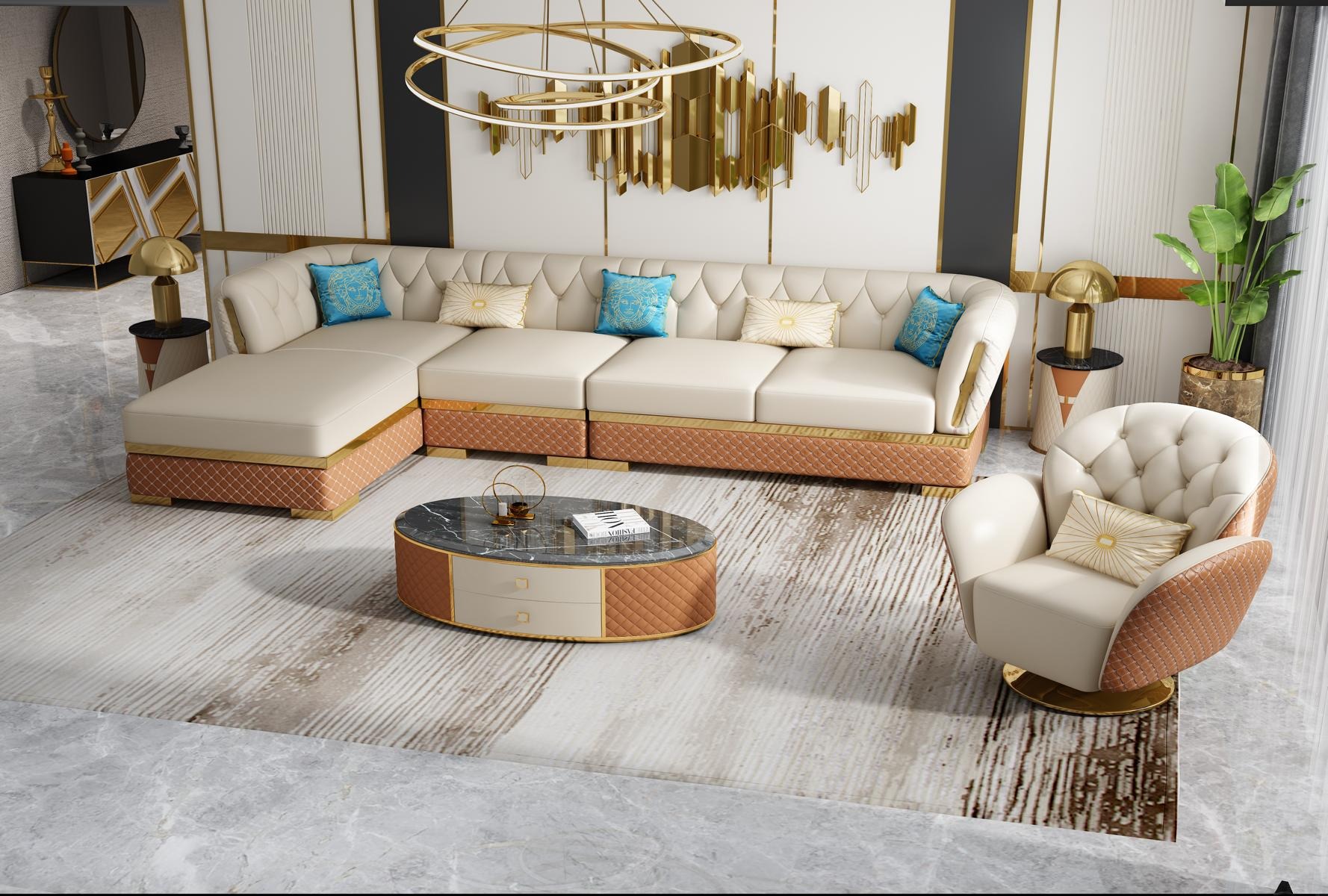 Entdecken Sie unser exklusives Ecksofa Möbel für Ihr Wohnzimmer! Das luxuriöse Sofa in L-Form besticht durch seine Maße von ca. 367 x 175 cm oder ca. 175 x 367 cm sowie einer Höhe von ca. 91 cm und einer gemütlichen Sitzhöhe von ca. 42 cm. Mit einer Tiefe von ca. 100 cm und einer angenehmen Sitztiefe von ca. 58 cm lädt dieses Eckgarnitur zum Verweilen ein. Genießen Sie die Freiheit der Farbwahl, da dieses Ecksofa in verschiedenen Farben erhältlich ist. Zudem haben Sie die Möglichkeit, das Material nach Ihren Wünschen anzupassen. Wählen Sie zwischen Premium Lederfaserstoff (70% Leder/30% Polyester), Premium Echtleder, Premium Textilstoff oder Premium Vollleder. Das Innengestell aus echtem Holz und der Federkern sorgen für Stabilität und Bequemlichkeit. Jedes Detail wird sorgfältig verarbeitet, sei es das Rindsleder aus Italien oder das Premium Kunstleder. Lassen Sie sich von der Qualität und dem Komfort unserer exklusiven Sofagarnitur überzeugen. Gestalten Sie Ihre Wohnlandschaft ganz nach Ihren Vorstellungen und wählen Sie das perfekte Ecksofa für Ihr Zuhause. Gönnen Sie sich Luxus und Komfort mit unserer exklusiven Ecksofa Möbel Wohnzimmer Couch Polster Luxus Sofa Eckgarnitur!