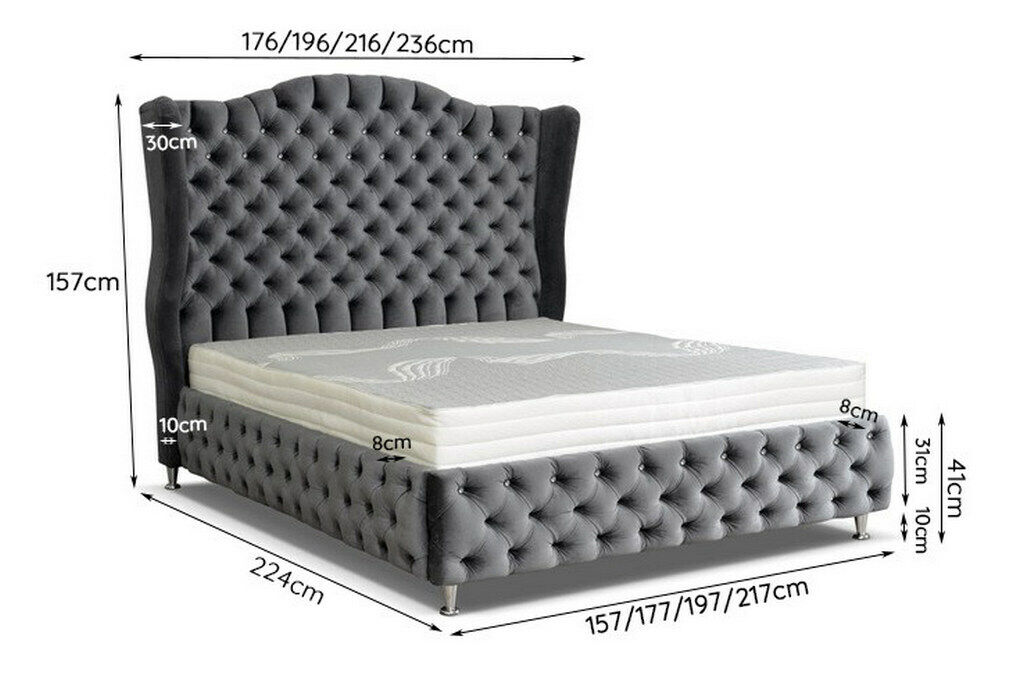 Erleben Sie Luxus und Eleganz in Ihrem Schlafzimmer mit unserem schwarzen Chesterfield Polster Doppelbett. Dieses exklusive Design-Bett wird mit größter Sorgfalt hergestellt und bietet Ihnen höchsten Komfort für erholsame Nächte. Wählen Sie Ihre Wunschgröße für die Matratzenaufliegefläche zwischen 140/160/180/200 x 200 cm oder entscheiden Sie sich für das Bettmaß von etwa 236 x 224 x 157 cm. Mit einer Höhe von ca. 157 cm und einer Länge von ca. 224 cm ist dieses Bett ein echter Blickfang in Ihrem Schlafzimmer. Sie haben die Möglichkeit, das Bett nach Ihren Vorstellungen individuell anzupassen. Wählen Sie aus verschiedenen Farben und Materialien, darunter Premium Kunstleder oder Stoff aus renommierten Textillieferanten wie DAVIS, PIK, AGMAMITO und weiteren. Zusätzlich können Sie verschiedene Optionen im Shop hinzufügen, wie eine Matratze für nur 299 Euro, einen Lattenrost für 149 Euro oder ein Hebesystem mit Bettkasten für 499 Euro. Entdecken Sie auch die Möglichkeit, das Bett in echtem italienischem Rindsleder anzufertigen. Veredeln Sie Ihr Bett mit Kristallsteinen oder Swarovski Kristallsteinen für eine luxuriöse Ausstrahlung. Erleben Sie mit unserem Chesterfield Polster Doppelbett ein Höchstmaß an Komfort und Stil in Ihrem Schlafzimmer – jetzt bestellen und Ihr Schlafzimmer in eine luxuriöse Wohlfühloase verwandeln.