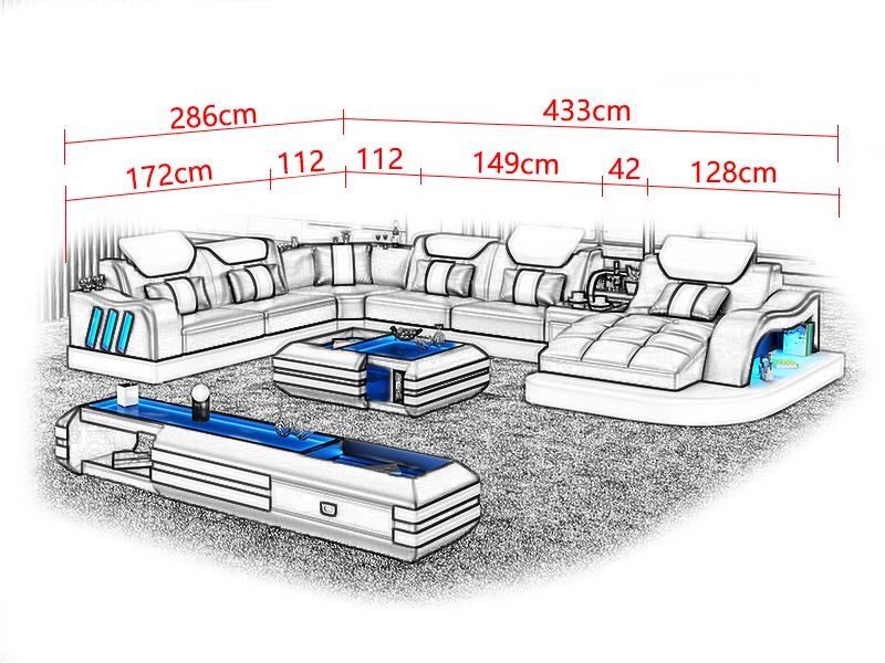 Entdecken Sie das perfekte Ecksofa für Ihr Zuhause - die ausgefallene Wohnlandschaft Polster eckgarnitur couchen sofas mit USB und LED! Mit XL Möbel haben Sie die Möglichkeit, Ihr Traumsofa in verschiedenen Größen und Farben zu erhalten. Wählen Sie aus einer Vielzahl von Farboptionen wie Zyan, Amethyst, Flieder und vielen mehr - ganz nach Ihrem Geschmack. Das Ecksofa in U-Form hat großzügige Maße von ca. 286 x 433 x 195 cm oder ca. 195 x 433 x 286 cm und bietet Ihnen eine bequeme Sitzhöhe von ca. 42 cm. Hergestellt aus Premium Lederfaserstoff (70% Leder / 30% Polyester) bietet dieses Sofa nicht nur Komfort, sondern auch Eleganz. Außerdem verfügt das Sofa über 3 USB-Anschlüsse, die bereits inklusive sind. Optional können Sie zwischen verschiedenen Materialien wie Premium Echtleder, Textilstoff oder Vollleder wählen, um das Sofa ganz nach Ihren Wünschen anzupassen. Möchten Sie Ihr Sofa noch weiter individualisieren? Entscheiden Sie sich für Zusatzfunktionen wie eine elektrische Relax-Fußstütze, ein Soundsystem über Bluetooth oder eine Unterbodenbeleuchtung mit Farbwechsel - alles ist möglich! Gönnen Sie sich Luxus und Komfort mit dieser einzigartigen Wohnlandschaft - bestellen Sie noch heute Ihr Ecksofa und verwandeln Sie Ihr Wohnzimmer in eine Wohlfühloase!