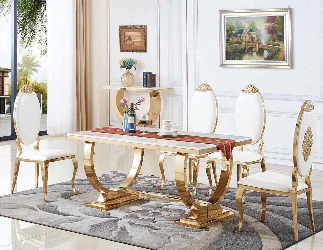 Erweitern Sie Ihr Esszimmer mit diesem klassischen 5-teiligen Esszimmer-Set von XL Moebel! Das Set besteht aus einem Esstisch und 4 Stühlen, die perfekt aufeinander abgestimmt sind. Der Esstisch hat Maße von ca. 140 cm Länge, 75 cm Höhe und 80 cm Tiefe, während die Stühle jeweils ca. 38 cm Länge, 120 cm Höhe und 44 cm Tiefe haben. Hergestellt aus hochwertiger Marmorimitation und Edelstahl, verleiht dieses Set Ihrem Esszimmer einen modernen Touch. Holen Sie sich jetzt dieses stilvolle Esszimmer-Set und genießen Sie Mahlzeiten in elegantem Ambiente!