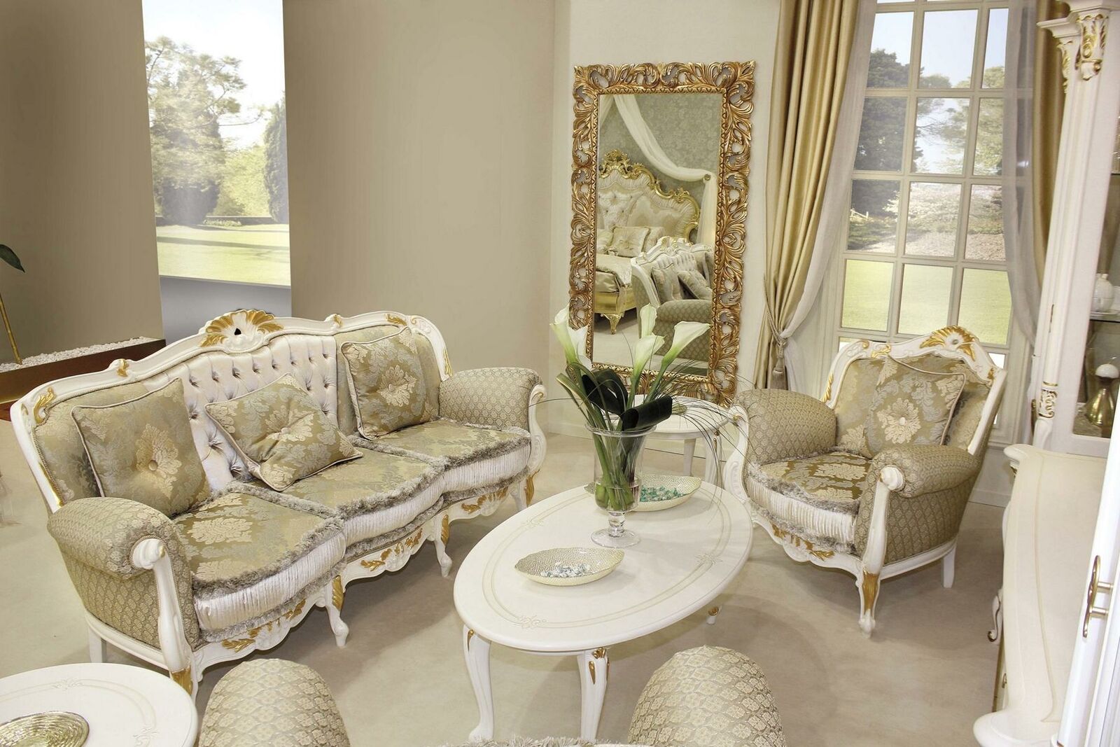 Willkommen zu Ihrem neuen Klassischen Wohnzimmer Set! Dank der italienischen Handwerkskunst von Claudio Saoncella erstrahlt Ihr Zuhause in neuem Glanz. Die Sofagarnitur besteht aus einem 3-Sitzer und einem 1-Sitzer, beide aus Massivholz und Stoff gefertigt. Mit den Maßen ca. 216 x 90 x 104 cm bzw. ca. 100 x 90 x 100 cm bieten sie Ihnen Komfort und Stil zugleich. Ergänzt wird das Set durch einen geräumigen Couchtisch (ca. 133 x 75 x 48 cm) und einen praktischen Beistelltisch (ca. Ø 60 x 50 cm). Gönnen Sie sich Luxus und zeitlose Eleganz mit diesem italienischen Möbelklassiker. Holen Sie sich Ihr Stück italienische Lebensart nach Hause!