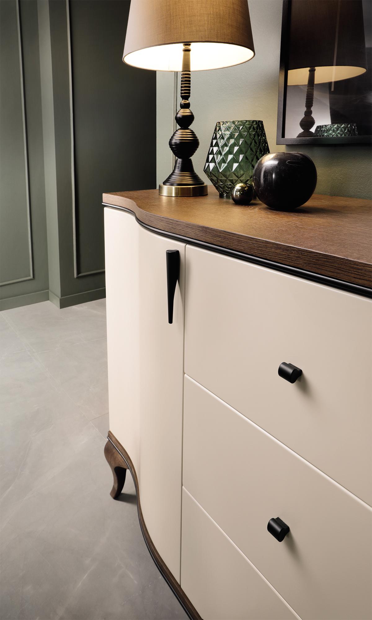 Rückwand & Einlegeböden: MDF (Mitteldichte Holzfaserplatte), furniert & lackiert