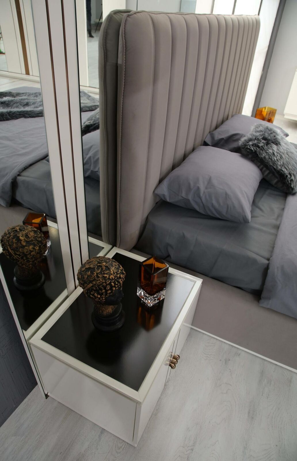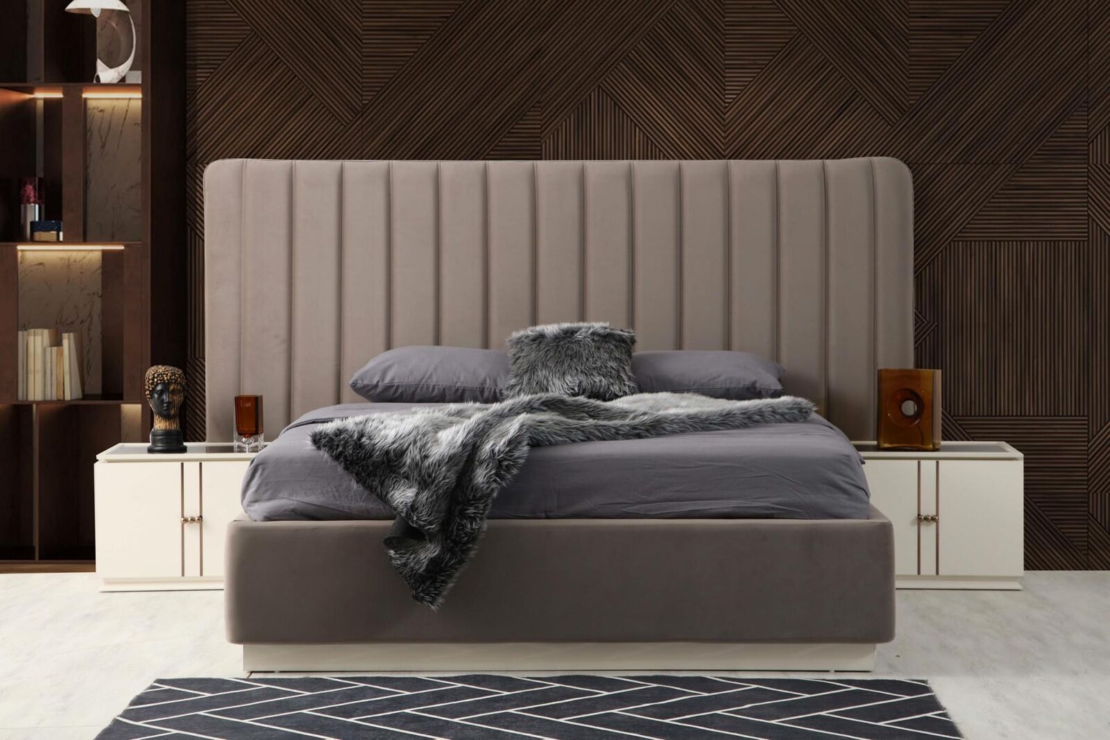 Wir präsentieren unser elegantes und luxuriöses Design-Schlafzimmer-Set, bestehend aus einem atemberaubenden Bett und zwei schlanken Nachttischen.