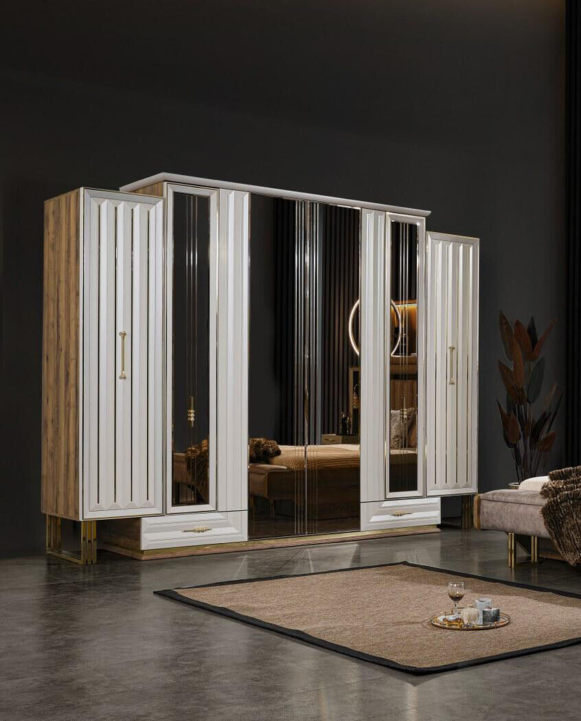 Garderobenschrank Luxus Kleiderschrank Holzschrank mit Spiegel Beige
