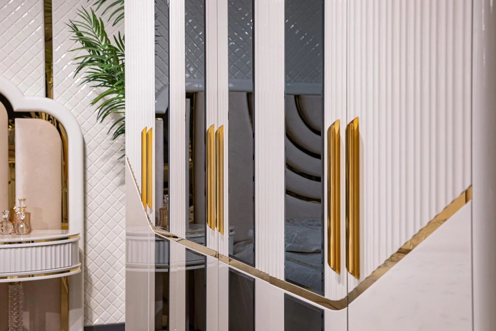 Kleiderschrank Schränke Schrank Design Holz Beige Gold Modern Möbel 270cm