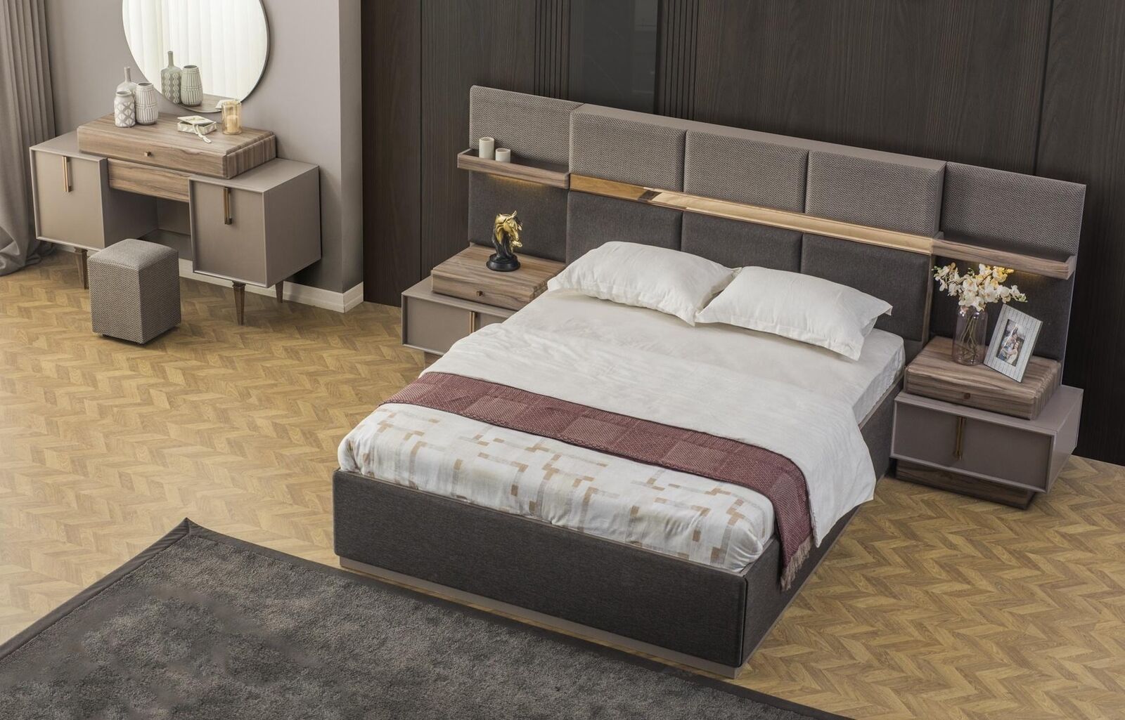 Erhöhen Sie den Komfort und die Eleganz Ihres Schlafzimmers mit diesem kompletten 6-teiligen Doppelbett-Set in Grau von XL Möbel. Das Set umfasst ein Bett mit den Maßen 224 cm x 171 cm x 130 cm, zwei Nachttische, einen Schminktisch mit Spiegel, einen Puff, einen Sessel und einen Hocker. Hergestellt aus hochwertigem Holz und Stoffmaterial, bietet dieses Set nicht nur ein schönes Design, sondern auch Funktionalität. Perfekt für Ihr Schlafzimmer! Holen Sie sich jetzt dieses Set und schaffen Sie eine stilvolle Atmosphäre in Ihrem Zuhause.