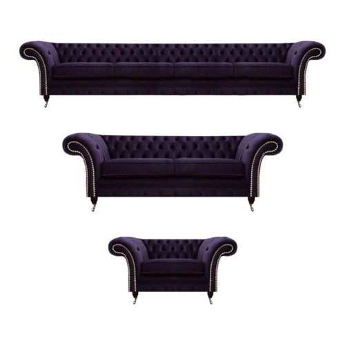 Diese luxuriöse Sofa-Garnitur in Lila mit Chesterfield-Design ist eine elegante Ergänzung für Ihr Wohnzimmer. Das Set besteht aus einem großzügigen 4-Sitzer-Sofa, einem komfortablen 2-Sitzer-Sofa und einem stilvollen Sessel.