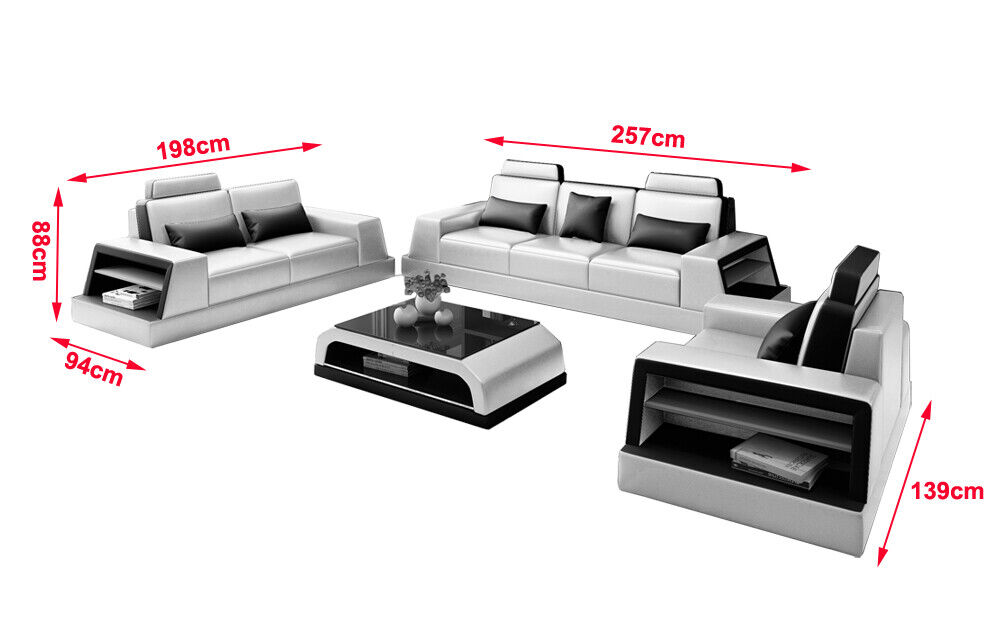 Entdecken Sie unsere moderne Sofagarnitur, bestehend aus einem 3-Sitzer, einem 2-Sitzer und einem gemütlichen Sessel! Die Maße des Sofas betragen ca. 257 x 88 x 94 cm, des 2-Sitzers ca. 198 x 88 x 94 cm und des Sessels ca. 139 x 88 x 94 cm. Die Polstermöbel sind in verschiedenen Farben erhältlich, wie Ocker, Safrangelb, Azurblau, und viele mehr. Das hochwertige Material besteht aus Premium Lederfaserstoff (70% Leder / 30% Polyester) und kann optional in verschiedenen Ausführungen ergänzt werden. Wählen Sie zwischen Gruppe 1 mit Premium Lederfaserstoff, Gruppe 2 mit echtem Premium Leder, Gruppe 3 mit Premium Textilstoff oder Gruppe 4 mit Premium Vollleder. Der Korpus der Sofagarnitur besteht aus einem stabilen Holzgestell, während die Sitzflächen, Rückenlehnen und Innenseiten der Armlehnen unterschiedliche Materialien aufweisen, je nach gewählter Gruppe. Bringen Sie mit dieser stilvollen Sofagarnitur frischen Wind in Ihr Wohnzimmer und genießen Sie Gemütlichkeit in einem modernen Design!