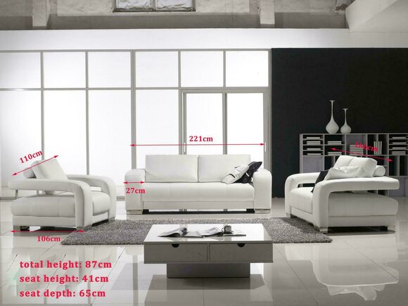 Entdecken Sie unsere luxuriöse Sofagarnitur, bestehend aus einem 3-Sitzer, 2-Sitzer und einem Sessel, einem wahren Blickfang in jedem Wohnzimmer! Hergestellt aus hochwertigem Premium Lederfaserstoff (70% Leder / 30% Polyester) in verschiedenen Farben wie Ocker, Safrangelb, Azurblau und vielen mehr, bietet dieses Set sowohl Komfort als auch Eleganz. Die Maße des Sofas sind: - 3-Sitzer: ca. 221 x 87 x 106 cm - 2-Sitzer: ca. 166 x 87 x 106 cm - Sessel: ca. 110 x 87 x 106 cm Der Rahmen aus echtem Holz, die Unterfederung mit Federkern und die strapazierfähigen Bezüge machen dieses Sofa nicht nur optisch ansprechend, sondern auch langlebig und bequem. Sie haben die Möglichkeit, zwischen verschiedenen Materialien wie Premium Echtleder, Textilstoff oder Vollleder zu wählen, um Ihren persönlichen Stil perfekt zu ergänzen. Entdecken Sie noch heute unsere Sofagarnitur und verleihen Sie Ihrem Zuhause einen Hauch von Luxus und Modernität!