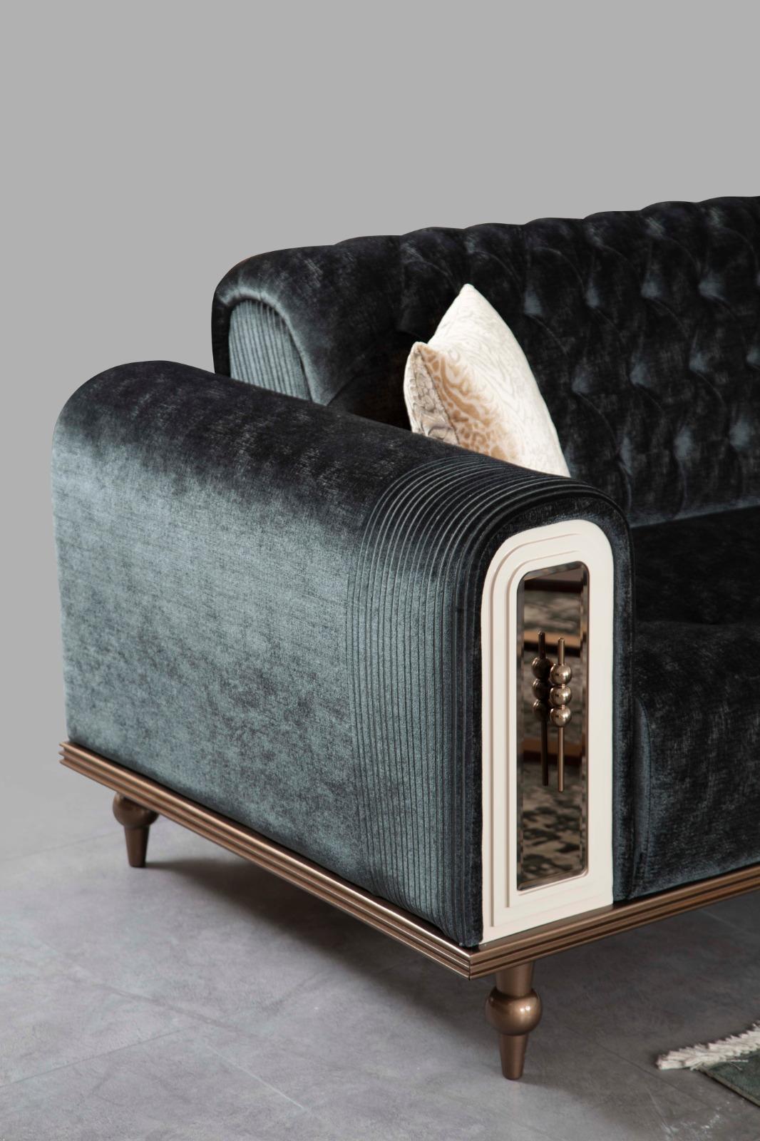 Entdecken Sie unsere elegante Sofagarnitur aus Samtstoff - das perfekte Couch Set für Ihr Wohnzimmer! Die hochwertigen Polstermöbel bestehen aus einem 3-Sitzer Sofa und zwei 1-Sitzer Sesseln, die mit ihrem modernen Design und samtigen Bezug in verschiedenen Grüntönen wie Moosgrün, Laubgrün oder Pistaziengrün überzeugen. Die Maße des gemütlichen 3-Sitzers betragen ca. 235 x 85 x 90 cm, während die beiden 1-Sitzer jeweils ungefähr 86 x 83 x 70 cm messen. Die Sitzhöhe beträgt angenehme 44 cm, und die Sitztiefe lädt mit ca. 56 cm zu entspannten Stunden ein. Hergestellt aus Holz und Textil, bietet dieses Polstermöbel-Set nicht nur Komfort, sondern auch Stil in Ihrem Zuhause. Holen Sie sich diese stilvolle Sofagarnitur in der abgebildeten Farbe und lassen Sie Ihr Wohnzimmer in neuem Glanz erstrahlen!