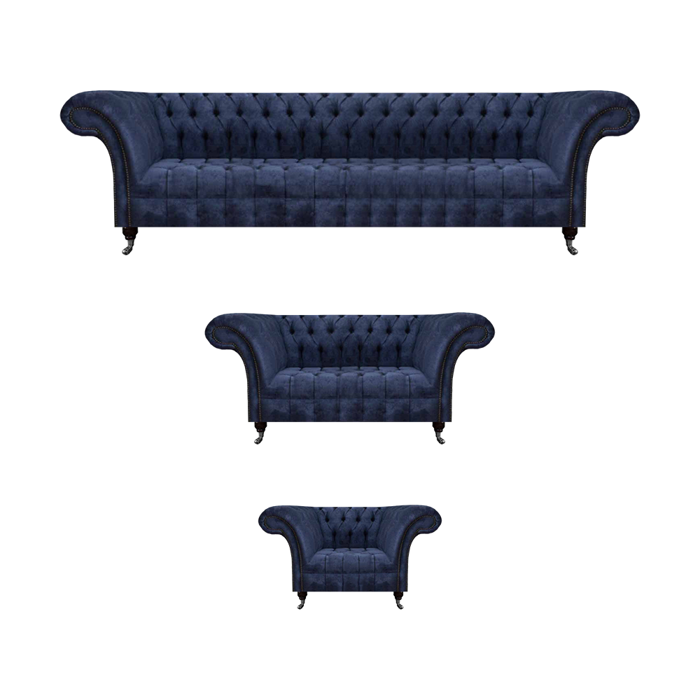 Diese exklusive Wohnzimmer Blaue Chesterfield Couchen Designer Sitzmöbel Sofagarnitur ist das perfekte Ensemble für Ihr Zuhause. Bestehend aus einem geräumigen 4-Sitzer Sofa, einem eleganten 2-Sitzer Sofa und einem gemütlichen Sessel, bietet dieses Set höchsten Komfort und stilvolles Design. Mit Abmessungen von ca. 275 x 90 x 80 cm beim 4-Sitzer, ca. 180 x 90 x 80 cm beim 2-Sitzer und ca. 130 x 90 x 80 cm beim Sessel, sind diese Möbelstücke ideal für gesellige Zusammenkünfte oder entspannte Stunden. Die hochwertige Verarbeitung, die weiche Polsterung und die ergonomisch geformten Rückenlehnen garantieren maximalen Komfort und machen dieses Set zu einem Blickfang in jedem Wohnzimmer.