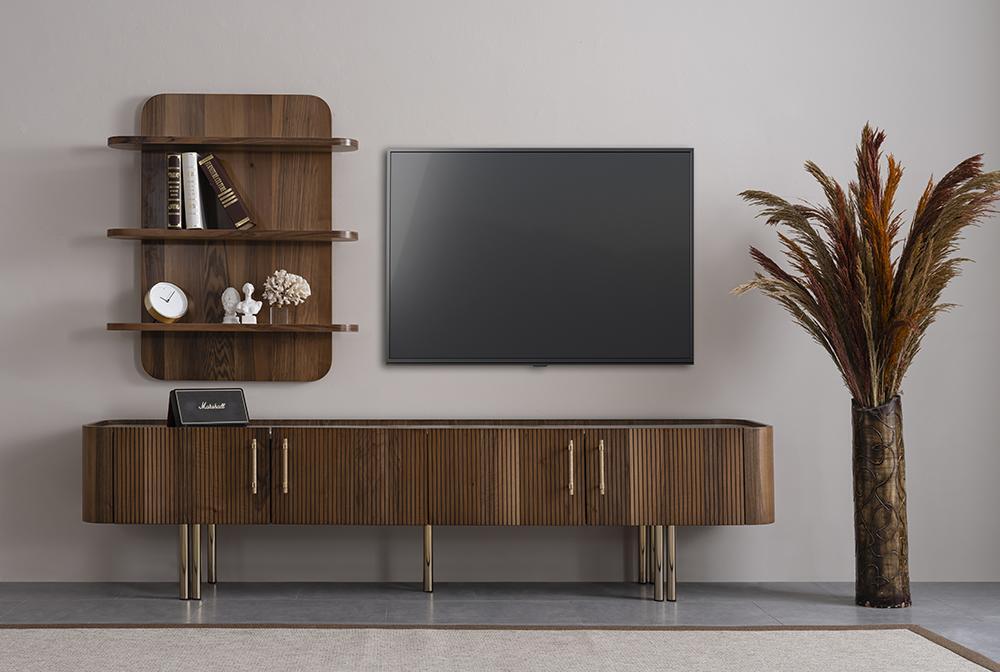 Living room furniture, Design, Entertainment unit, Luxury TV stand, Brown, Wall shelves