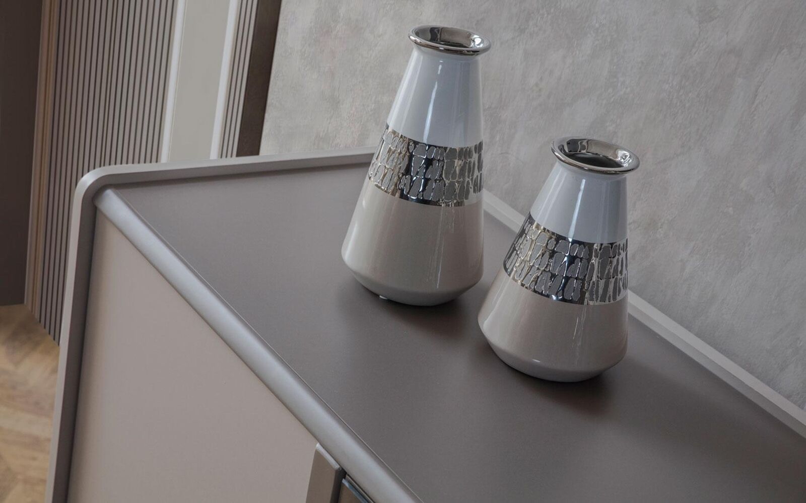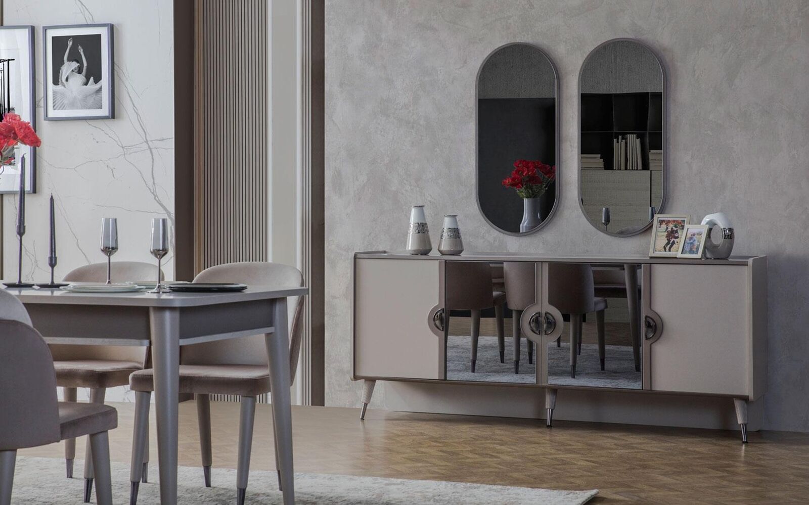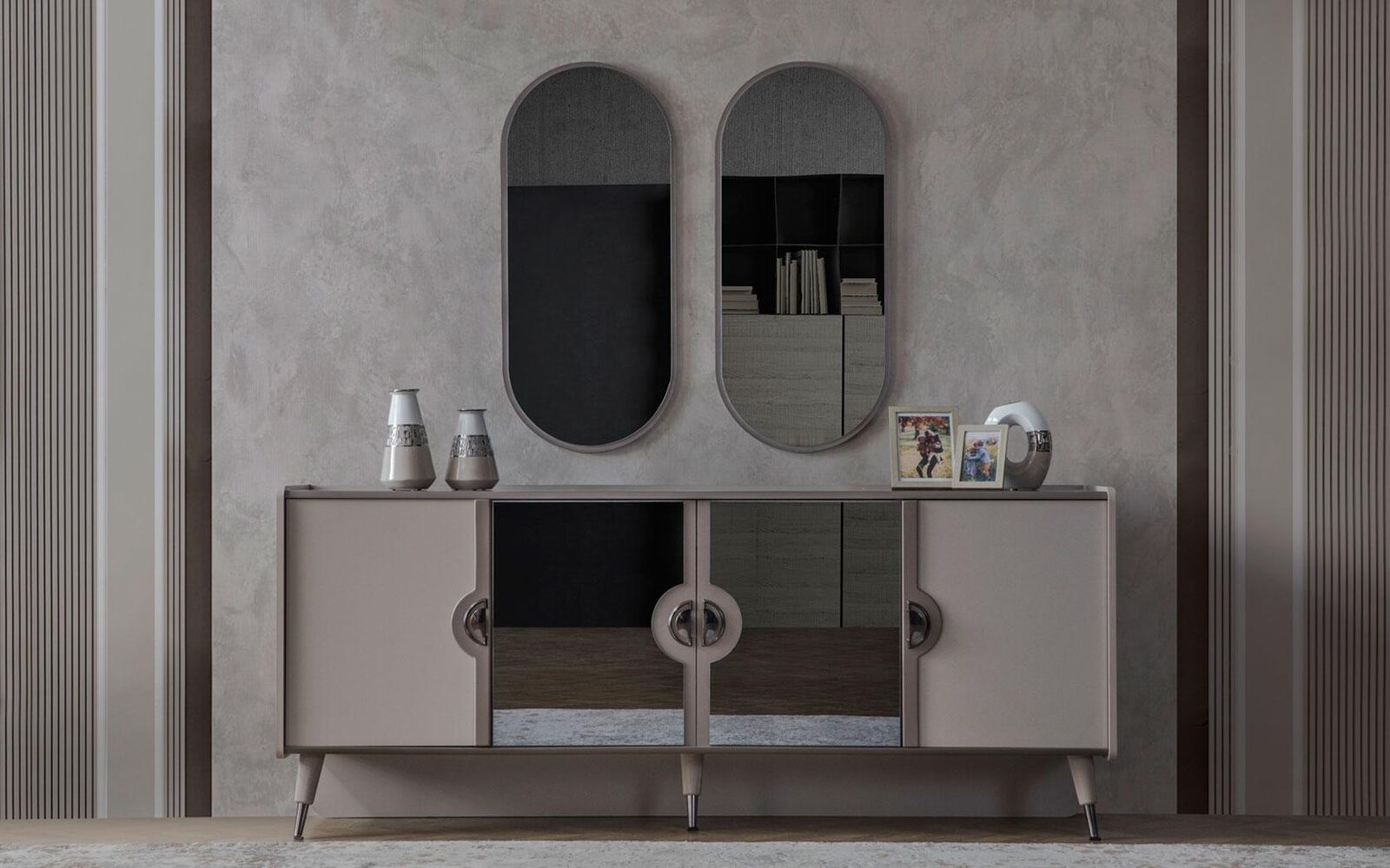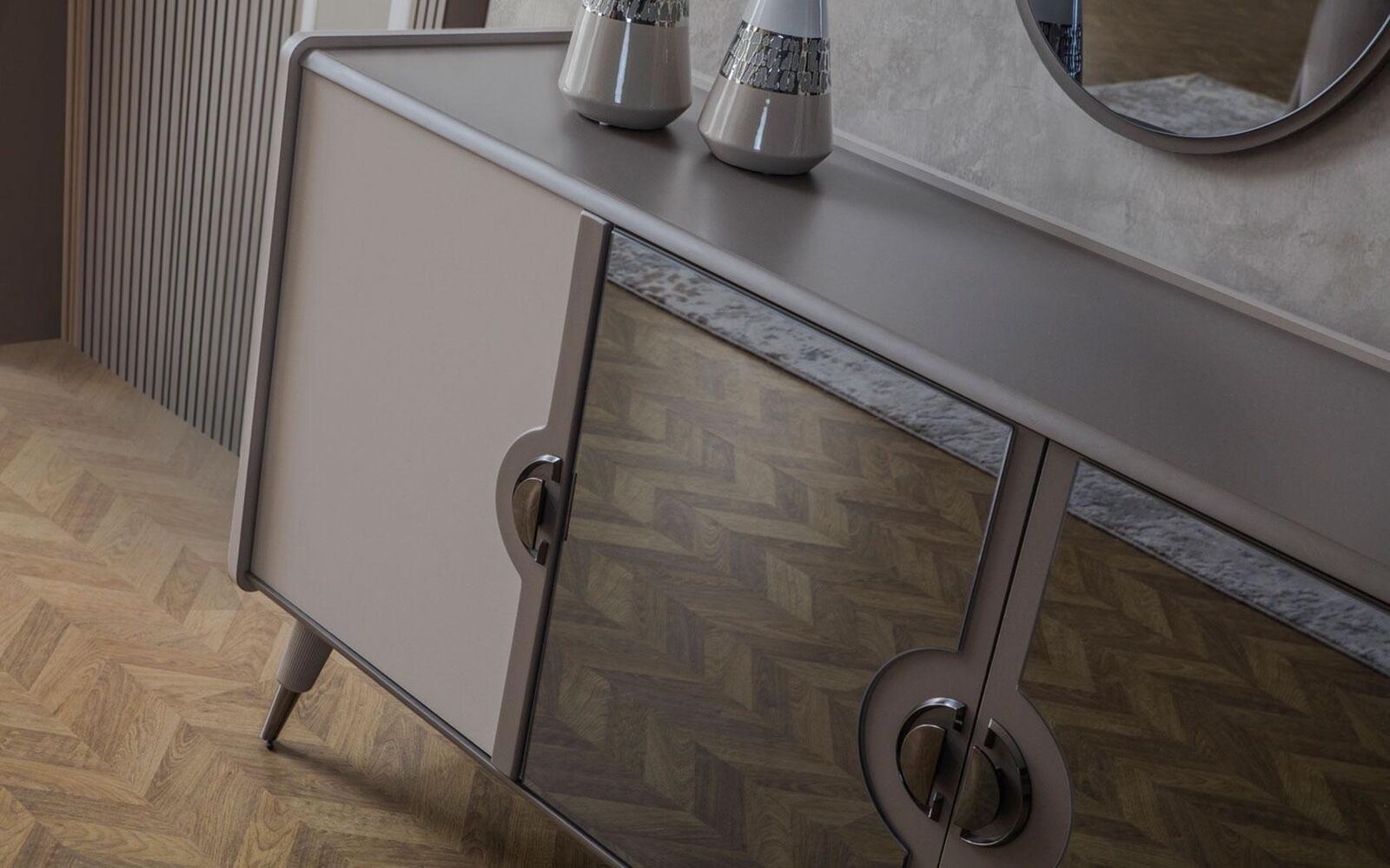 Graue Möbel Garnitur Designer 4-türiges Sideboard Exklusive Spiegel 3tlg