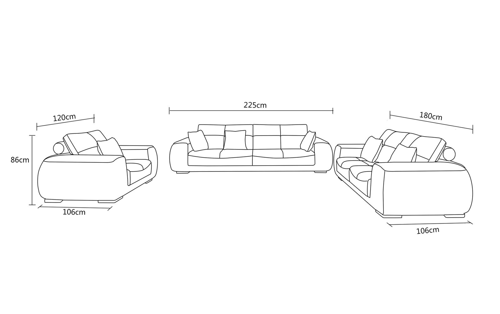 Entdecken Sie unsere modern gestaltete Sofagarnitur aus hochwertigem Premium Lederfaserstoff! Diese elegante Couch-Garnitur besteht aus einem komfortablen 3-Sitzer Sofa sowie zwei bequemen Einzelsofas. Wählen Sie aus einer Vielzahl von Farben wie Kirschrot, Rubinrot, Lavendelblau und vielen mehr, um Ihrem Wohnbereich eine stilvolle Note zu verleihen. Die Maße dieses Sofas sind: - 1 Sitzer: ca. 120 x 106 x 86 cm - 3 Sitzer: ca. 225 x 106 x 86 cm - Sitzhöhe: ca. 43 cm - Sitztiefe: ca. 59 cm Die Sofagarnitur ist mit Premium Lederfaserstoff (70% Leder / 30% Polyester) bezogen, was für Langlebigkeit und Komfort sorgt. Optional bieten wir auch Echtleder oder Textilstoff als Bezugsmaterial an. Das Innengestell der Sofagarnitur besteht aus echtem Holz, was für Stabilität und Langlebigkeit sorgt. Machen Sie Ihr Wohnzimmer zum gemütlichen Treffpunkt für Familie und Freunde mit dieser stilvollen Sofagarnitur! Kontaktieren Sie uns gerne für individuelle Farb- oder Größenanpassungen. Machen Sie Ihr Zuhause mit unserer Sofagarnitur zu einer gemütlichen Wohlfühloase!
