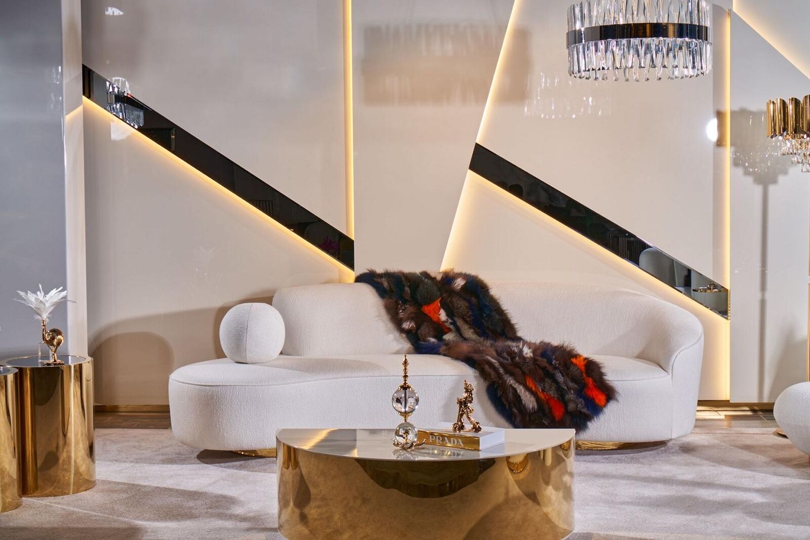 Weiße Couchgarnitur, 3+1 Sitzer, Designer, Runder Glas-Couchtisch, 3-teilig Set, Eleganz, Stilvoll