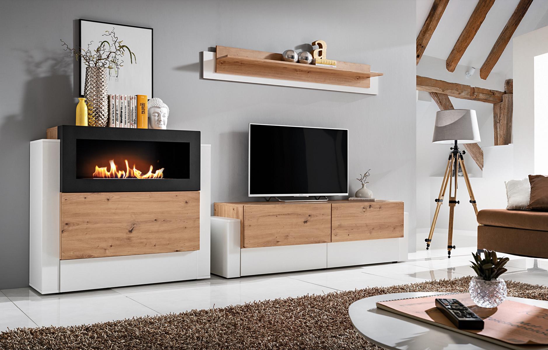 Designer Weiß Wohnwand Luxus Kommode mit Kamin Einrichtung Wohnzimmermöbel